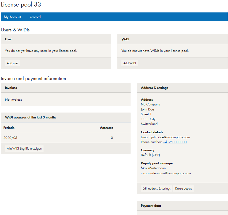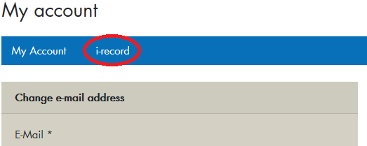 On the "My Account" page you will find the personal details. This includes e-mail address, name and address details. The link "i-record", which is located in the blue bar, takes you to the administration page of all your license pools.