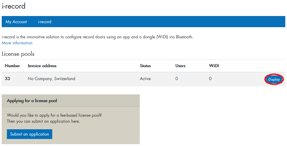 After the pool manager has logged on to the respective country website using e-mail and password, he has access to the license pool via his web account. As described above, the link "i-record" can be used to display an overview of all license pools assigned to him. The table "License Pools" shows the license pool number, billing address, status and number of users and WiDI assigned to the license pool. To view the details of a license pool, click on the blue "Display" button.