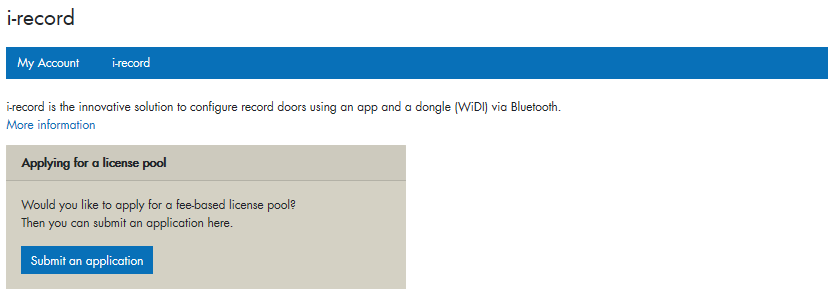 In order for an organisation/company to use i-record for the configuration and maintenance of record doors, a fee-based licence pool must first be applied for from the record country organisation. There are two different ways to apply for a license pool: