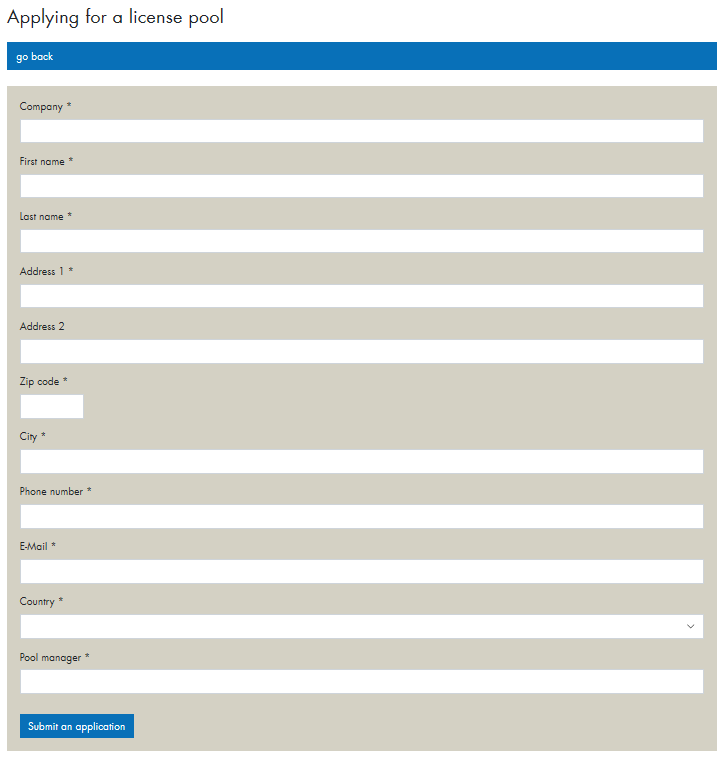 In the opening form, all the data required for the application, such as company name, name, address, e-mail and phone number, can now be entered. The e-mail of the desired pool manager, who will later manage the license pool, must also be filled in. It is important to mention that the pool manager must also already have a valid account on the website.