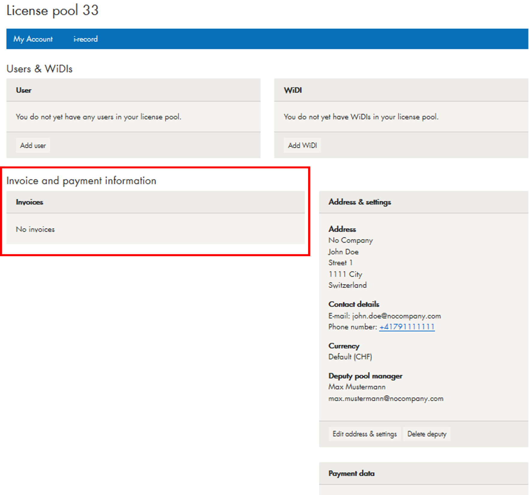 record will now check the details of the application and contact you if necessary. If the application is approved, record will open a license pool. The person responsible for the license pool in the application will be entered as pool manager. This pool manager is then informed by email that the license pool has been opened. The pool manager is requested to enter the missing address data on the website. After the terms and conditions have been accepted, the payment data must be entered. Once everything has been filled in and saved, the license pool changes from the "Initialization" state to the "Active" state. The pool manager can now add users and WiDI to the license pool.
