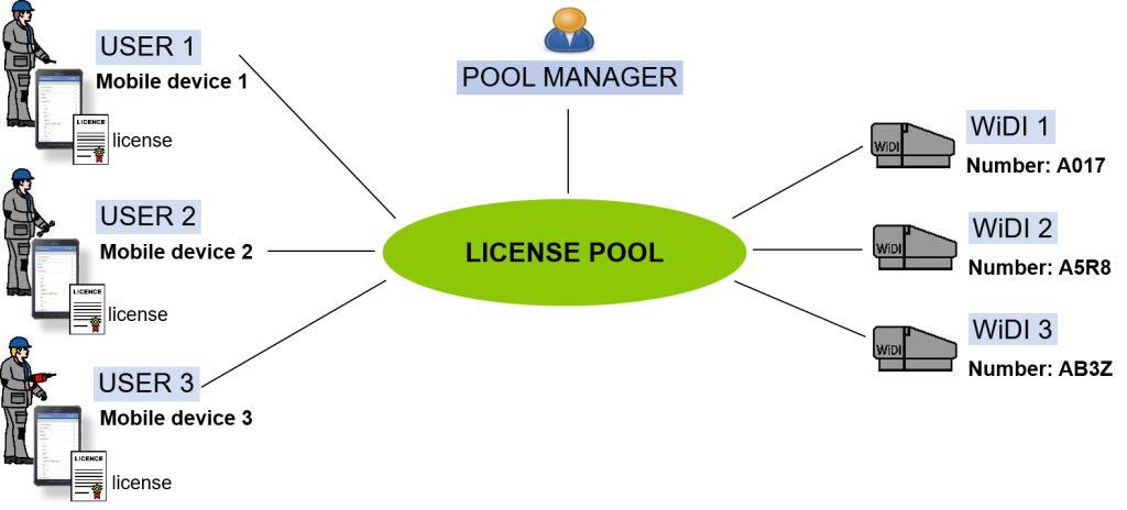 The license pool is managed by the pool manager. The pool manager is the person responsible for i-record in an organisation/company. He can add users and WiDI to the license pool and remove them from it.