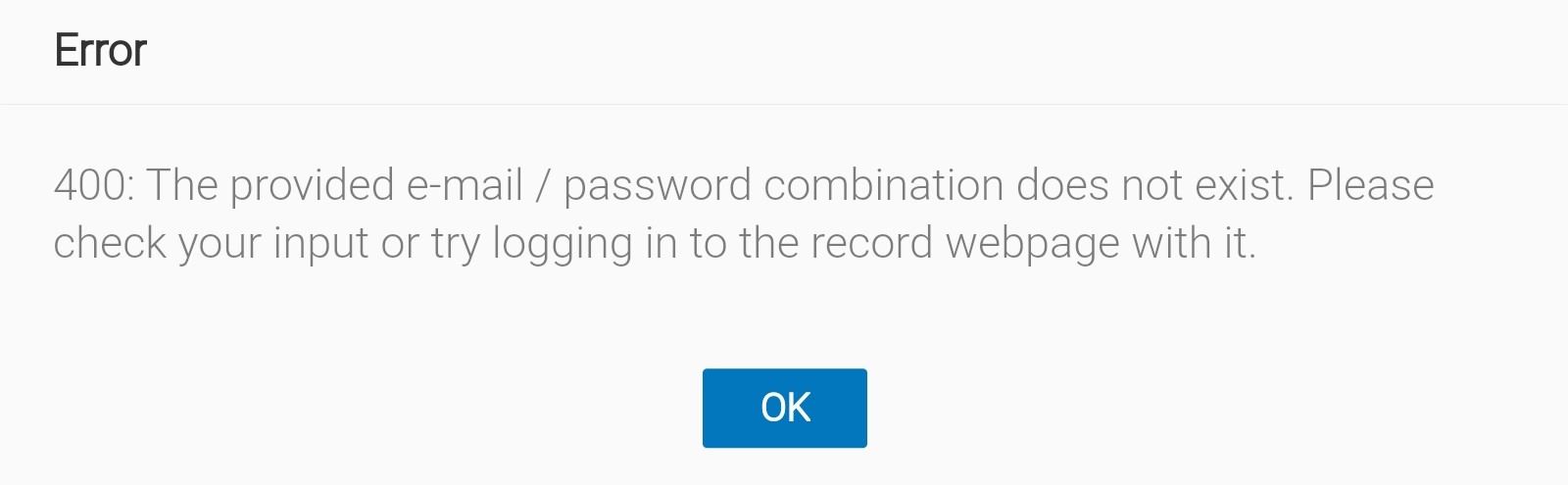 If error message "400: The provided e-mail / password combination does not exist. Please check your input or try logging in to the record webpage with it." appears in the app, the e-mail / password combination entered in the i-record app is incorrect. This can happen either when logging into the app or during normal use of i-record.