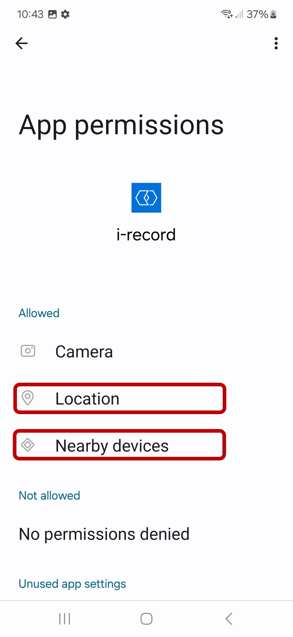 Open Settings --> Apps --> i-record on your Android device. Under Permissions, ‘Location (GPS)’ and ‘Nearby devices’ must now be activated (see second image below).